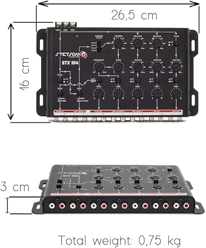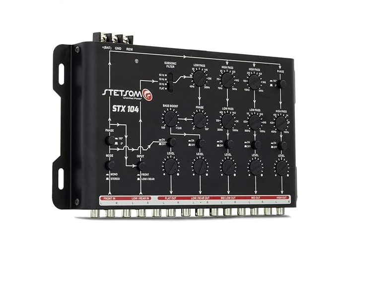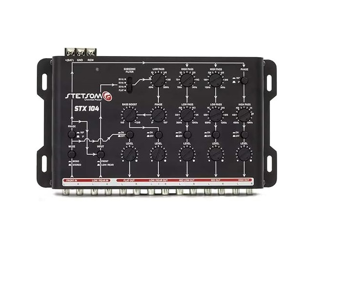 Crossover elettronico modello stx104 a 5 vie; High Pass: 400 to 10000 hz; Mid High Pass: 150 – 12500 hz; Mid Low Pass: 50 – 250 hz; Low Pass: 50 – 250 hz; Subsonic filter: 20/30/50/80 hz; Bass Boost: (25 – 110 hz) (0 to +12dB; 60 hz); Rapporto segnale/rumore: > 90 db;