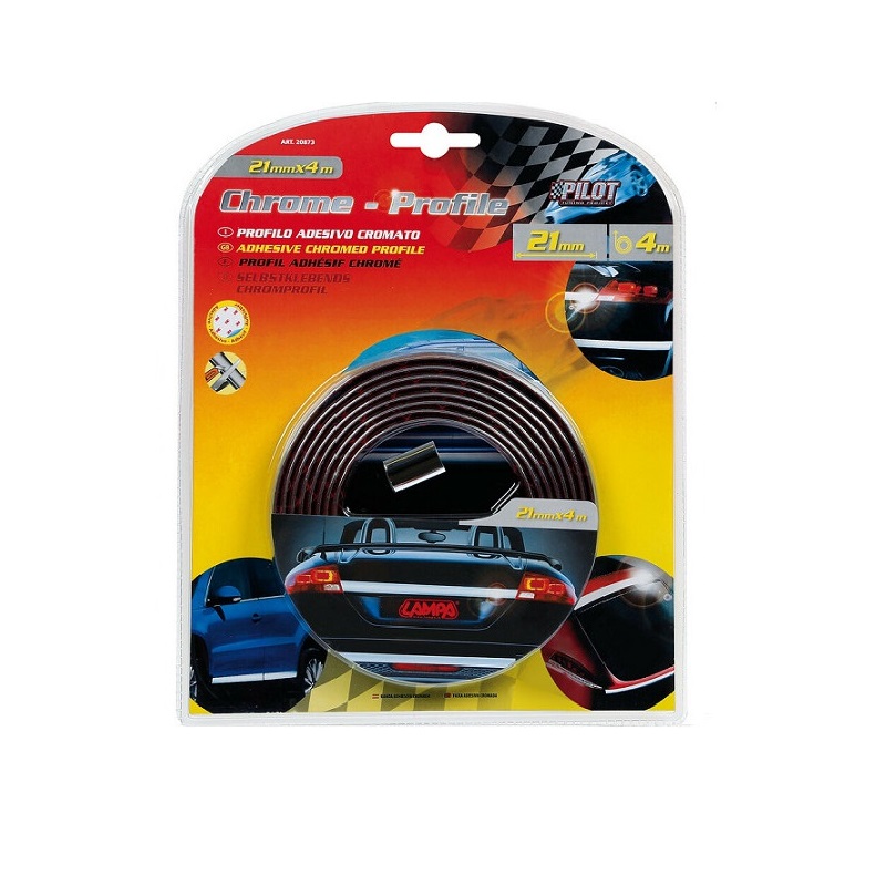 UNIVERSALE PER TUTTE LE AUTO Profilo adesivo cromato – 4 m – 21 mm Può essere curvato e tagliato a misura. Adesivo speciale per un’ottima presa su tutte le superfici plastiche e metalliche. Ideale per: portiere griglie radiatore paraurti fiancate cruscotto