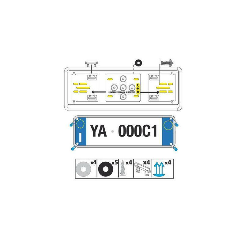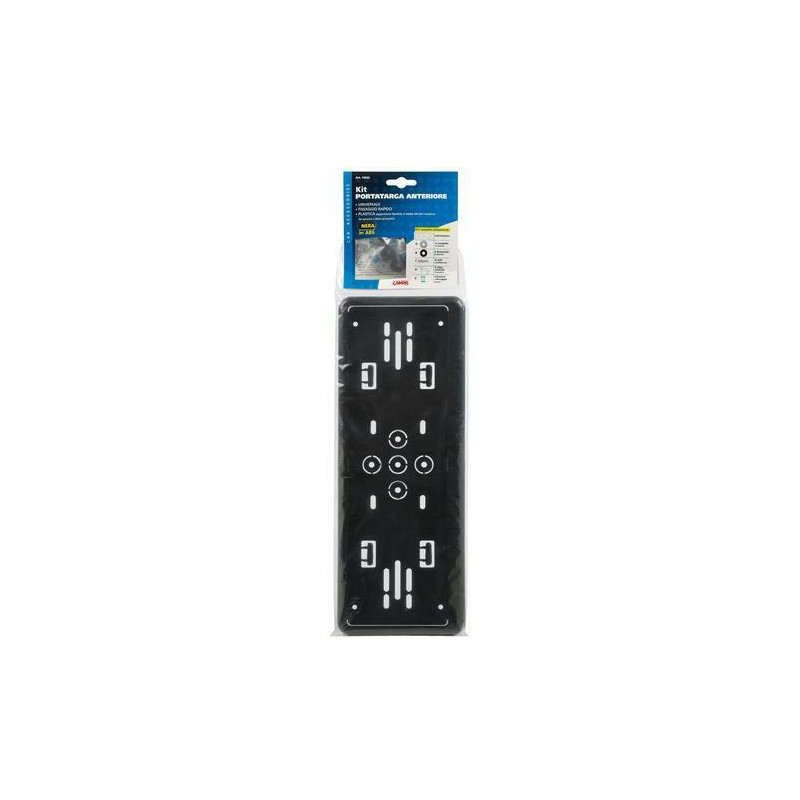 UNIVERSALE PER TUTTE LE AUTO PORTA TARGA UNIVERSALE ANTERIORE Dimensione: 375×145 mm MISURE ESTERNE Fissaggio rapido. Universale. Plastica leggermente flessibile. Si adatta alle lievi curvature del paraurti o della carrozzeria Kit completo composto da: Portatarga, 4 rondelle in metallo, 6 distanziali in plastica, 4 viti autofilettanti, 4 clips centrali in plastica, 3 bottoni di fissaggio azzurri, 1 bottone di fissaggio bianco
